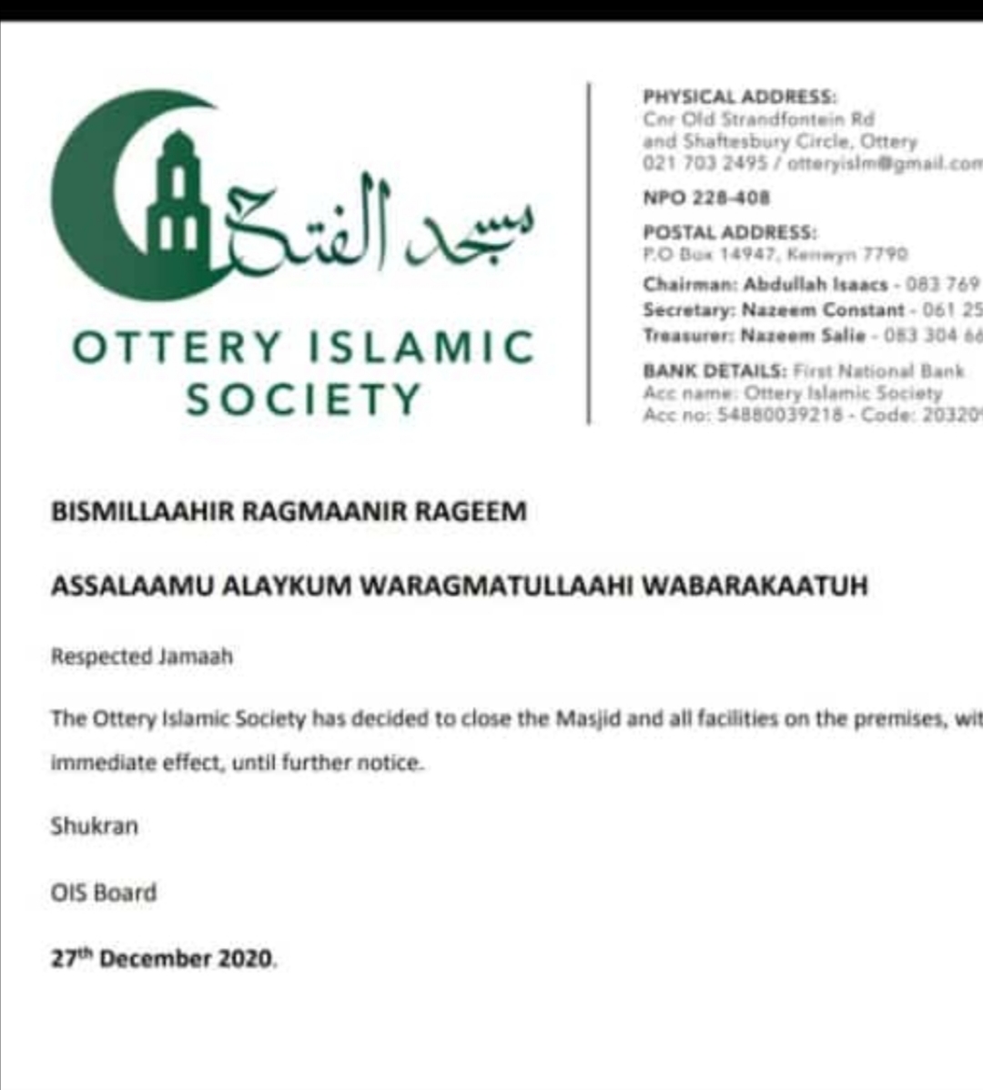 Subhanallah , Due to a large amount of covid cases in Cape town Over the festive season . Masjied is on Lockdown Level 3